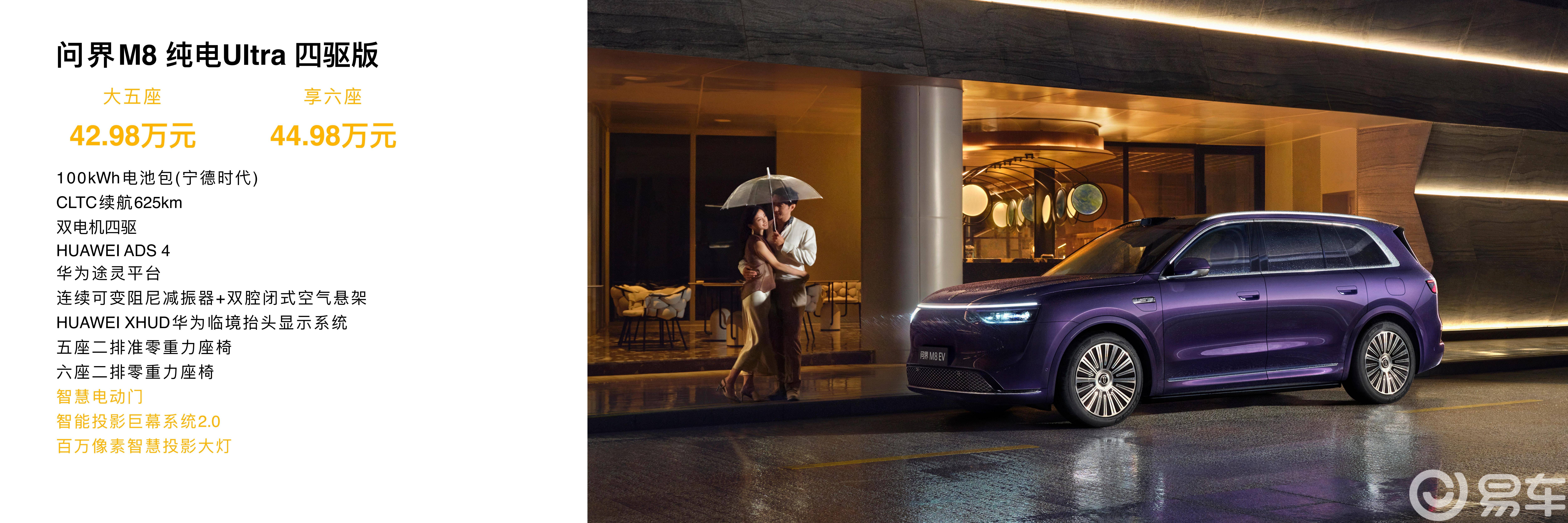 -Ultra四驱版:价格42.98/44.98万元,在Max+四驱上增加智慧电动门、激光投影系统、百万像素投影大灯。