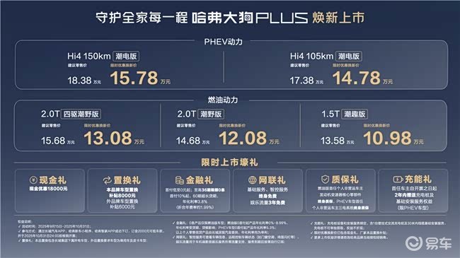为了让消费者更好地选到自己心仪的车型,全面满足用户的全场景用车需求,哈弗大狗PLUS共推出两种动力五款车型,其中燃油版限时优惠换新价10.98-13.08万元,PHEV版限时优惠换新价14.78-15.78万元。