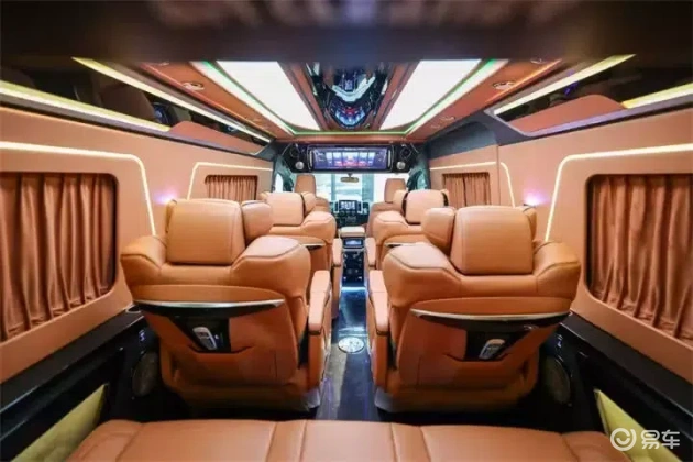 进入商务舱,这里有四个埃尔法同款的航空座椅,配备通风、加热、按摩及旋转功能,舒适度极高。最后一排为联排沙发床,可180度放平,方便乘客休息。尽管9座布局使车内空间略显紧凑,但功能齐全,能够满足多种需求。车内装饰豪华且周到,包括软包覆、隐私窗帘、充电系统和杯托等。顶灯颜色多样,造型美观,可任意调节。