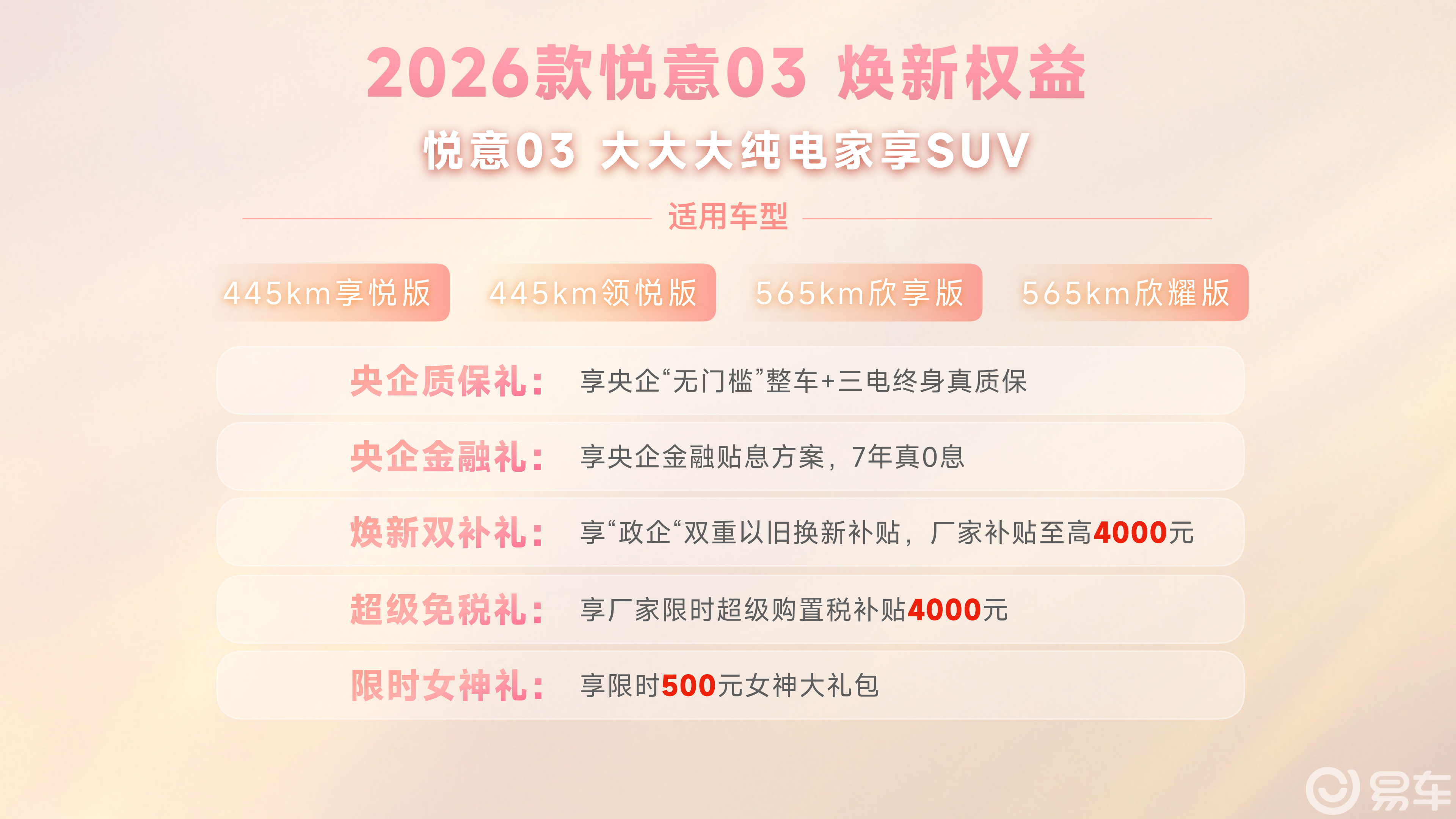 三月春暖,悦见花开。3月8日妇女节,实力演员张若昀亮相直播间,为“大大大纯电家享SUV”的焕新助阵——2026款悦意03正式“挚爱”上市,为每一位女神送上春天的礼物。新车推出445km、565km两种续航共6款车型,官方售价7.98万-11.99万元,以“加配不加价”的诚意精准锁定年轻家庭尤其是女性用户的心 。