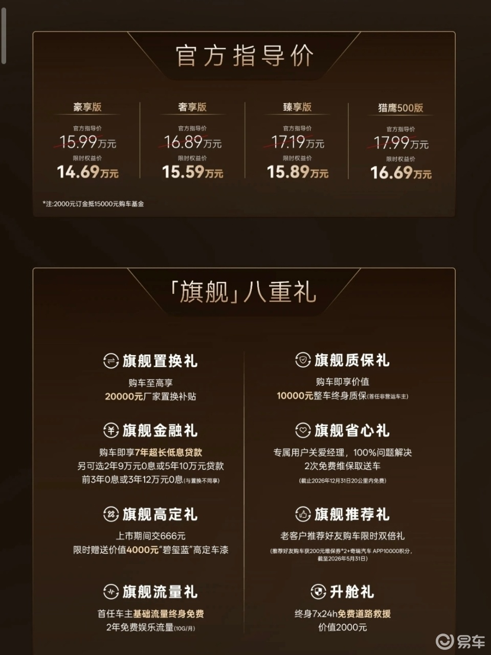 好久没提燃油车了吧,这不它来了,瑞虎9这次2.0T涡轮增压发动机直接干到了14.69万,高配的燃油车还上了猎鹰500,不过这车采用的还是麦弗逊加多连杆布局,喜欢瑞虎9的建议次低配起步选,入门版还是配置简陋了些。