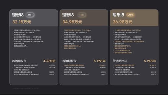 于2025年9月7日24:00前确认订购理想i8 Max、理想i8 Ultra的用户将享受价值超5.19万元的首销权益,包含2,000度电的理想免费超充权益、7kW家用充电桩或30,000理想积分(二选一)、VLA司机大模型终身免费使用权、二排舒享套装(含二排零重力座椅、二排双侧小桌、二排侧窗遮阳帘)。