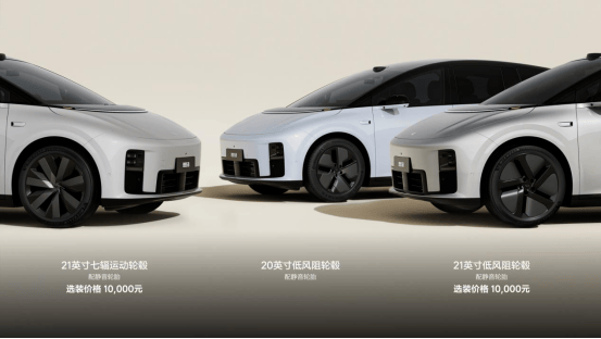 轮毂搭配方面,理想i8标配20英寸低风阻轮毂,另外还有两款选装的21英寸轮毂,价格10,000元,选装轮毂均匹配米其林静音轮胎,用户可根据自己喜好自由选择。