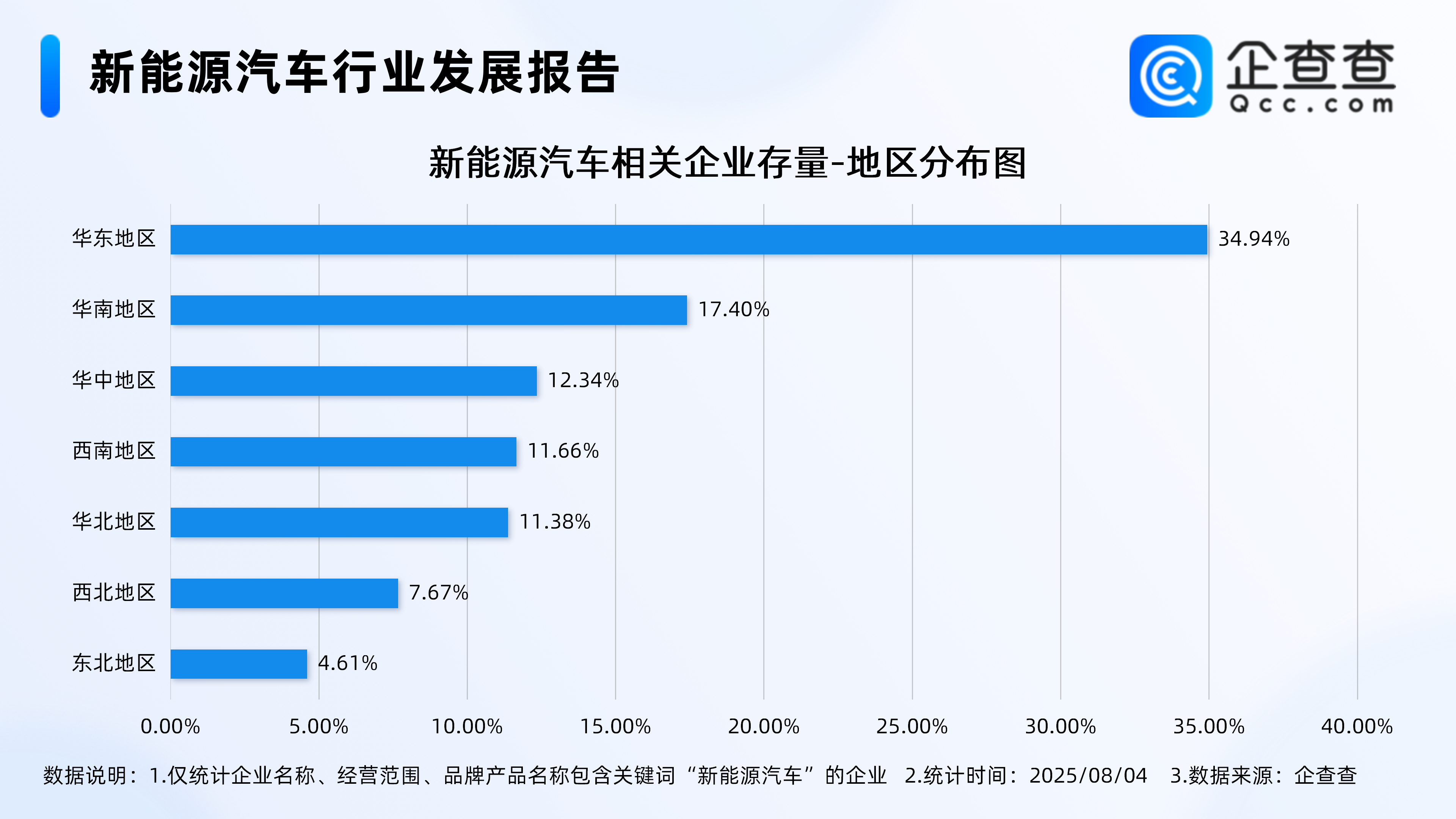 企查查数据显示,从地区分布来看,分布在华东地区的新能源汽车相关企业最多,占比34.94%。其次,分布在华南地区、华中地区的相关企业分别占比17.40%、12.34%。