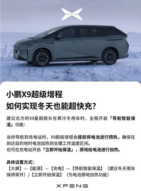 此外,小鹏汽车建议北方的用户在用车时,全程开启“导航智能保温”功能。到充电站时,X9超级增程会提前将电池进行预热,确保在到达目的地时电池加热到合理工作温度区间。也可在充电站开启“立即开始保温”,原地给电池进行加热。