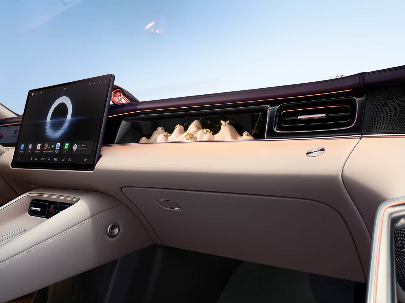 副驾驶前方创新地设计了名为灵感橱窗的开放式储物空间,内部带有磁吸底板,用户可以将喜爱的毛绒手办或玩偶放置其中,让座舱成为彰显个性的移动展厅。此外,新车还配备了一体式运动座椅、HUD抬头显示以及流媒体内后视镜等舒适科技配置,全方位提升驾乘体验。