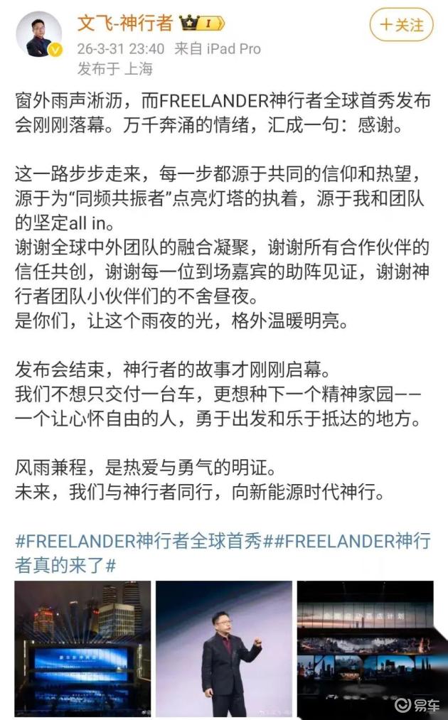2026年3月31日,奇瑞和捷豹路虎联手打造的新品牌FREELANDER神行者,终于迎来了全球首秀。