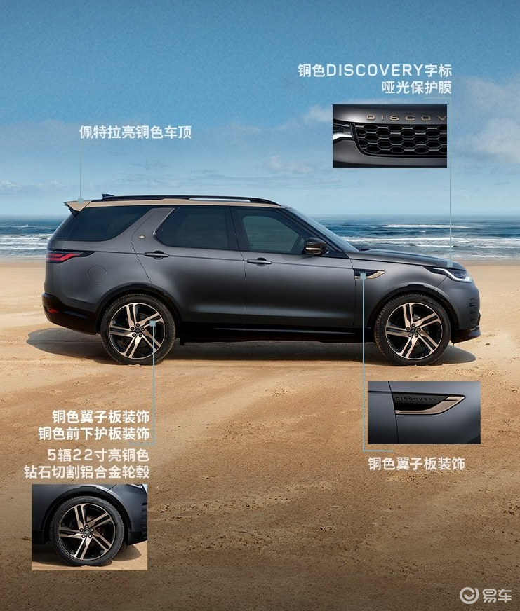 侧面车顶略带弧度,配备粗壮行李架和鲨鱼鳍,倾斜的C柱是发现系列的标志性设计。尾部配备较大尺寸的扰流板,熏黑尾灯组被黑色饰板连接,排气管采用隐藏式布局。车身长宽高为4956/2073/1888毫米,轴距2923毫米,定位中大型SUV。